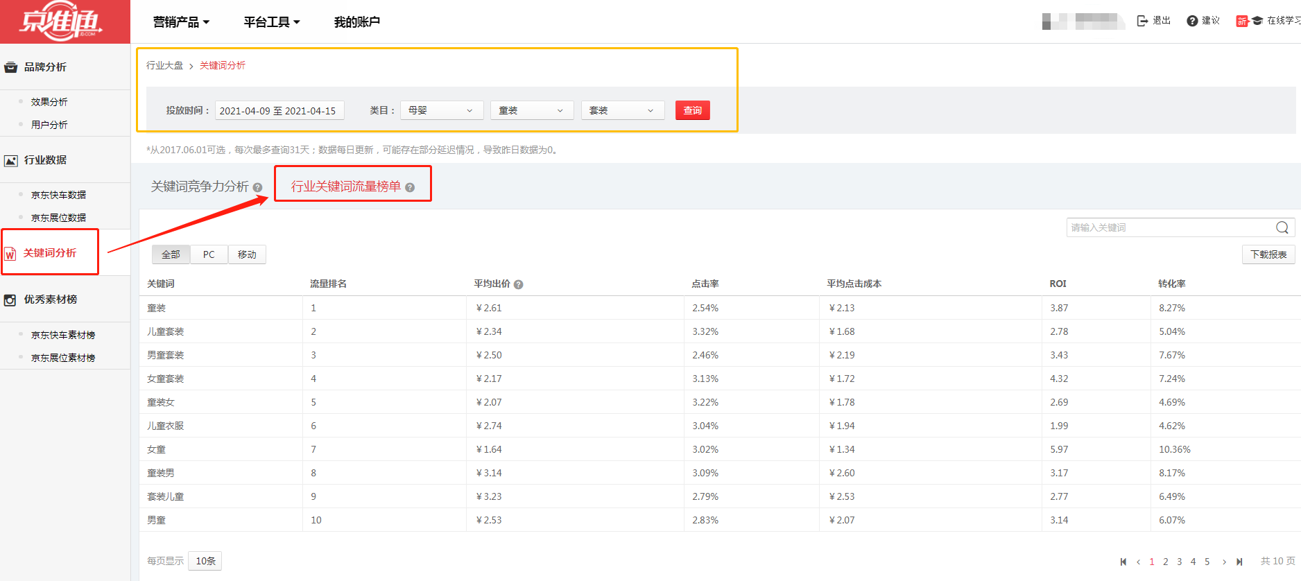 京準(zhǔn)通行業(yè)大盤是一個經(jīng)常被商家忽略的找詞路徑。當(dāng)商家在京準(zhǔn)通中開通快車之后,就能在行業(yè)大盤中看到整體行業(yè)的快車推廣數(shù)據(jù)。在里面可以看到有關(guān)鍵詞分析,選擇行業(yè)關(guān)鍵詞流量榜單,就可以看到整個行業(yè)流量排名前一百的關(guān)鍵詞。