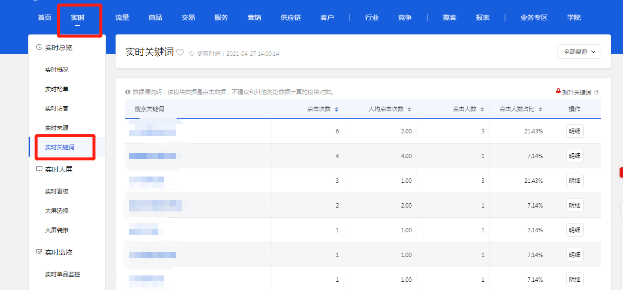 在商智中除了能找到行業(yè)熱搜詞之外,也可以看到自身的成交詞,路徑是商智-實時-實時關(guān)鍵詞,什么是實時關(guān)鍵詞呢?實時關(guān)鍵詞是基于實時點擊數(shù)據(jù)流,計算用戶搜索關(guān)鍵詞后點擊店鋪中商品和店鋪的數(shù)據(jù),包括點擊人數(shù)、點擊次數(shù)等指標(biāo)。對于每個關(guān)鍵詞,還可查看用戶通過搜索這個詞點擊了店鋪中的哪些商品。