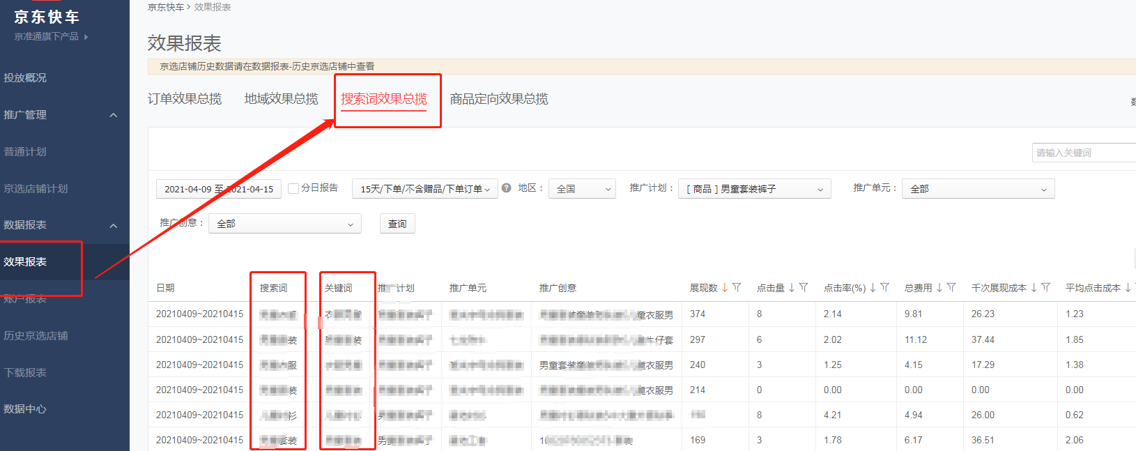 除了行業(yè)大盤里面的行業(yè)熱搜詞之外,對于已經(jīng)投放過快車和海投的商家來說,可以在效果報表里面看到搜索詞效果總覽。可以選擇最近七天的數(shù)據(jù),然后看七天內(nèi)數(shù)據(jù)最好的關(guān)鍵詞,從中找出有訂單的成交詞和展現(xiàn)點擊率高的引流詞加入的新計劃中進(jìn)行測試。這里要注意的是搜索詞效果總覽只會統(tǒng)計最近七天的數(shù)據(jù),商家們要養(yǎng)成開啟計劃之后每七天下載一次數(shù)據(jù)報表的好習(xí)慣喲。