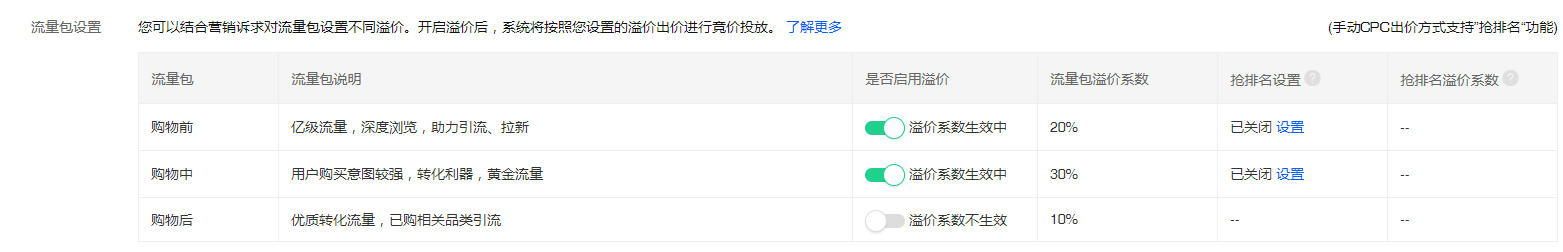 第二個:購物中;購物中的流量包主要是在商詳頁、購物車頁面以及已關(guān)注商品列表頁。這里的瀏覽相對比較精準(zhǔn),都是一些加購過的客戶或者是正在瀏覽同類型產(chǎn)品的客戶,購買意圖會很強(qiáng),同時也會比較容易轉(zhuǎn)化,所以購物中的溢價相對就可以做的高一點(diǎn)。