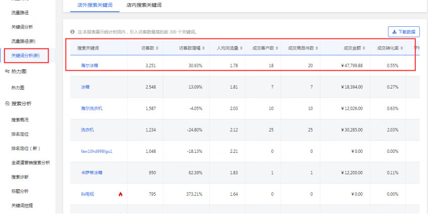 點(diǎn)擊商智--流量--點(diǎn)擊關(guān)鍵詞分析,選擇近三十天數(shù)據(jù),去查看品牌詞是否有成交,轉(zhuǎn)化率高不高,通過這個(gè)去判斷這個(gè)品牌人群對(duì)于這個(gè)品牌的依賴性。一般品牌店鋪人群對(duì)于品牌依賴性都是比較大的,所以基本上品牌店鋪都是可以去做京選店鋪的。