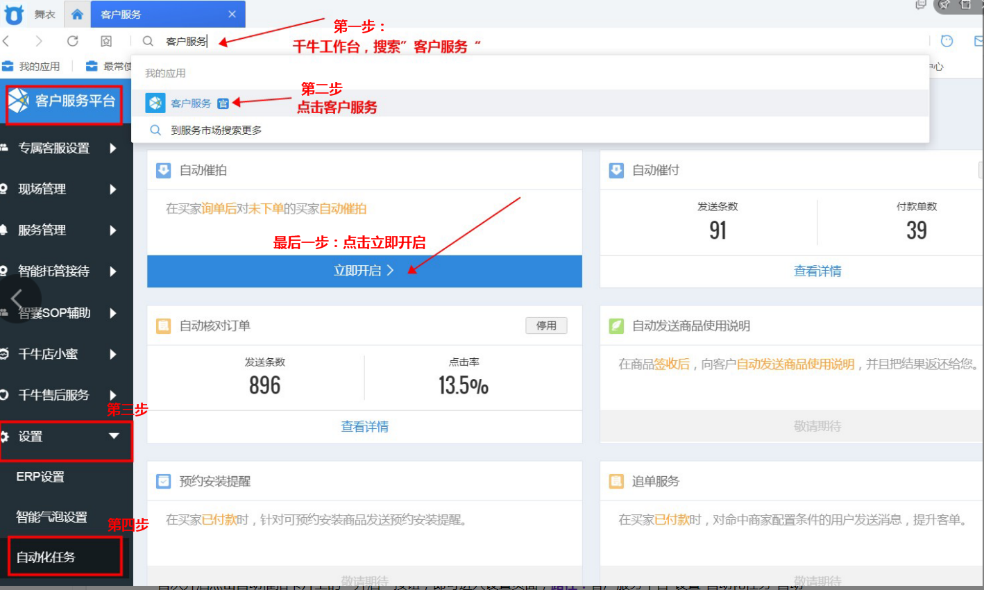 -開啟:打開千牛,進(jìn)入“客戶服務(wù)平臺”插件,點擊設(shè)置-自動化任務(wù),即可進(jìn)入自動化任務(wù)功能頁面;