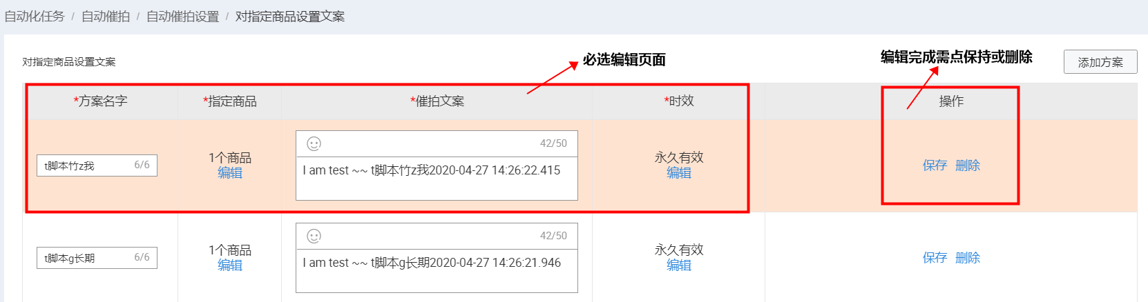 點擊“設(shè)置”可設(shè)置內(nèi)容包括:方案名字、指定商品、催拍文案、時效、操作。前四項“*”項編輯結(jié)束后務(wù)必在操作列點擊保存,方案即可生效。