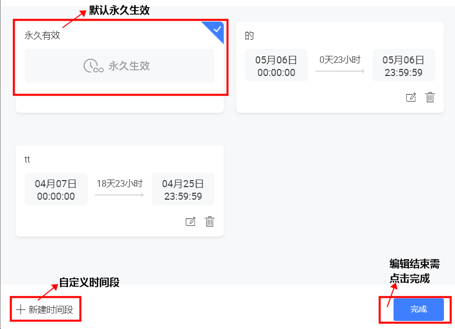 --時效:點擊編輯,可選擇永久生效,或在左下角“+”新建時間段自定義時間,編輯結(jié)束勾選需要時間后點擊右下角完成。針對一些活動期的商品設(shè)置話術(shù)時,需要增加話術(shù)的生效時間。只有方案的時效在生效中,這個方案才會下發(fā)。
