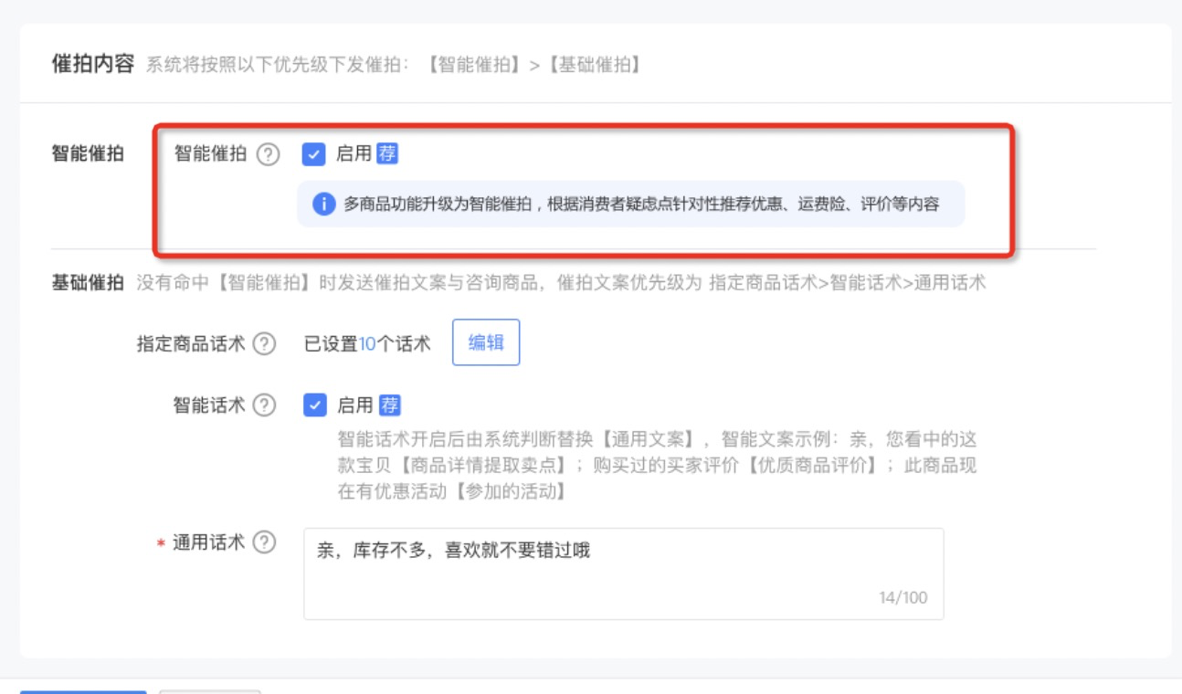 點擊“自動催拍”卡片上的開啟,即進(jìn)入規(guī)則設(shè)置頁面,支持對詢單但是未下單的高意愿用戶,推動催拍話術(shù)及商品。